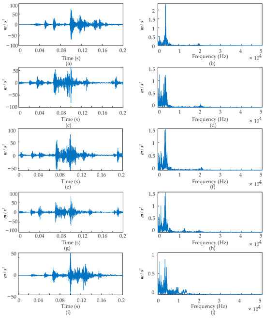UCG-type OLTC vibration signals under different operating conditions. (a) Normal condition time-domain signal, (b) normal condition frequency-domain signal, (c) upper static contact loosening time-domain signal, (d) upper static contact loosening frequency-domain signal, (e) lower static contact loosening time-domain signal, (f) lower static contact loosening frequency-domain signal, (g) insulation plate loosening time-domain signal, (h) insulation plate loosening frequency-domain signal, (i) moving contact loosening time-domain signal, (j) moving contact loosening frequency-domain signal.