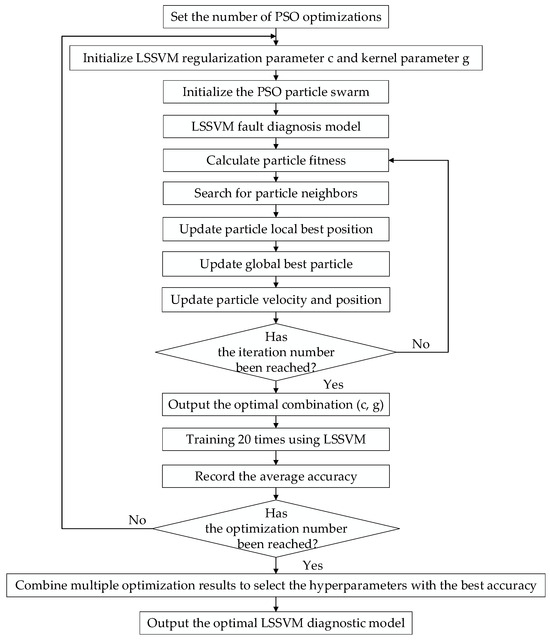 As an intelligent optimization algorithm, Particle Swarm Optimization (PSO) has the characteristics of few parameters, fast calculation speed, and strong global search ability [35]. Therefore, this study employed PSO to optimize the hyperparameters of LSSVM. To prevent PSO from falling into a local optimum, PSO was used to optimize the hyperparameters multiple times, so as to obtain the optimal hyperparameters of LSSVM.