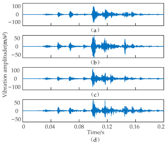 The sensor adopts Beijing QUATRONIX ULT2001 piezoelectric vibration sensor (QUATRONIX Electronics Co., Ltd., Beijing, China) with a range of ±50 g and a sensitivity of 100 mV/g, and the frequency response range is 0.5~15 kHz. A data acquisition card with a sampling frequency of up to 100 kHz is employed. The data acquisition process is illustrated in Figure 3.