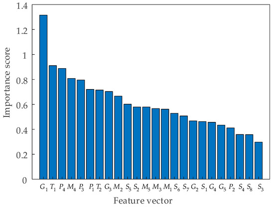 The dataset was divided into a training set and a testing set with a ratio of 8:2. The training set was used to train a random forest model. After training, feature importance scores were calculated for each feature. The importance scores of each feature calculated by the random forest algorithm are shown in Figure 10. The higher the score, the greater the role of the feature in the model. According to the order of the important score, the selected features were combined, and the LSSVM was used for fault diagnosis. The average accuracy rate of 20 repeated tests was calculated and is shown in Figure 11.