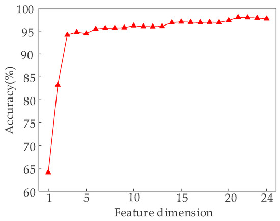 From Figure 10, it can be seen that the importance scores of each feature calculated by the random forest algorithm were all above 0.2. Using the first three features of the importance scores, G1, T1, and P4, the average diagnostic accuracy reached 94.16%, which is shown in Figure 11. When using the first 21 dimensions of features, the fault diagnosis accuracy reached as high as 98.58%. However, when the feature dimensions increased from 21 to 24, the fault diagnosis accuracy decreased to 97.98%. Redundant features reduced the accuracy of fault diagnosis by 0.6%.
