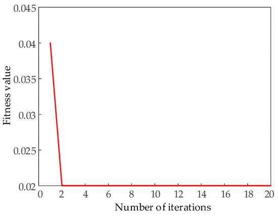 Based on the multi-feature dataset, with 50 samples for each OLTC operating condition, a random sampling method was used to divide the dataset into an 80% training set and a 20% testing set. Using the classification error rate of the testing set as the fitness function, the iterative curve of PSO during a single search process is shown in Figure 12. Figure 12 indicates that PSO rapidly converges to a relatively optimal solution within the first two iterations, leading to a sharp decrease in the classification error rate, which then reaches a steady-state value. This demonstrates that PSO can effectively enhance the classification performance of LSSVM.