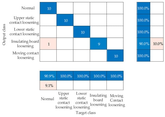 The results of fault diagnosis using the optimized LSSVM are shown in Figure 13. The identifying accuracy for the 4th type of fault (insulating board loosening) is 90%, while the identification accuracy for all other faults reaches 100%. This diagnostic result shows that the optimized LSSVM has excellent identification performance on most fault types and can accurately distinguish different fault types. This can improve system reliability and maintenance efficiency, reducing equipment downtime and maintenance costs.