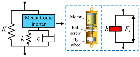 As shown in Figure 2. The mechatronic inerter is connected to the spring and damper in series, and the load spring is connected to the mechatronic inerter, spring, and damper in parallel. The blue box shows the structure of the mechatronic inerter. The mechatronic inerter consisting of motor, ball screw and flywheel, When the mechatronic inerter is stimulated by vibration, the linear motion is converted into the rotating motion of the flywheel and motor through the ball screw, and the electromagnetic force generated by the motor is output in parallel with the inertial force.