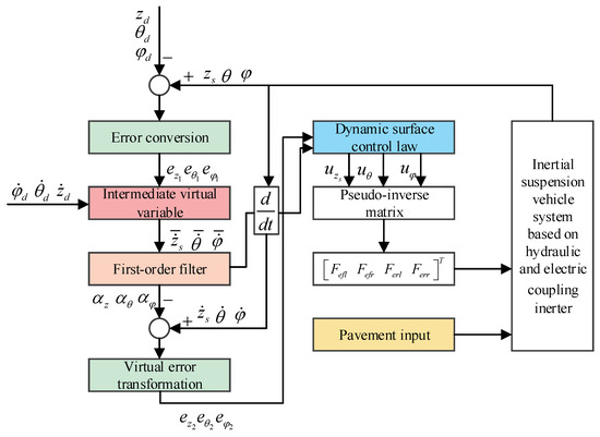 Therefore, the schematic diagram of the dynamic surface control system designed in this paper is shown in Figure 5. The road input offers external excitation. Vertical displacement and pitch and roll angle are derived from the dynamic inertial suspension system based on the hydraulic and electric coupling inerter, and the error equation is acquired with the predefined ideal vertical displacement and pitch and roll angle. Through intermediate virtual variable and first-order filter, the dynamic surface control law of vertical, pitch, and roll motion is obtained, and the pseudo-inverse matrix is constructed to address the issue. The electromagnetic force of the four suspensions can be obtained.
