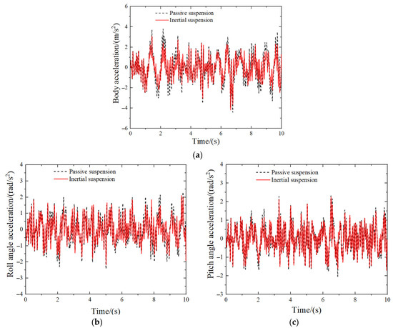 In the above formula, , , and , respectively, represent the objective function of body acceleration, pitch angle acceleration, and roll angle acceleration; , , and , respectively, represent the RMS values of body, pitch angle, and roll angle acceleration of the inertial suspension to be optimized; , , and , respectively, represent the RMS values of body, pitch angle, and roll angle acceleration of passive suspension.