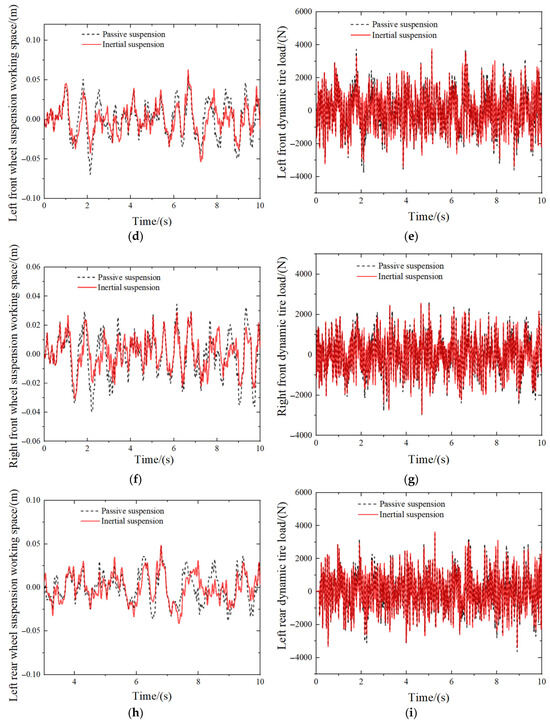 As can be observed from the time domain comparison presented in Figure 6, the acceleration of the vehicle body and the acceleration of the side angle are conspicuously suppressed throughout the entire time domain. The suspension working space of the four-wheel is significantly smaller than that of the passive suspension. The acceleration of the pitch angle and the dynamic tire load of the four-wheel are marginally less than those of the passive suspension. As can be seen from Table 4, the performance of the inertial suspension based on dynamic surface control is significantly better than that of the passive suspension. Compared with the passive suspension, the RMS value of the body acceleration of the inertial suspension decreases by 23.73%. Compared with that of the passive suspension, the RMS of the performance indicators of the roll angle acceleration of the inertial suspension decreased by 15.28%. For the RMS of pitch angle acceleration, the performance of inertial suspension improved by 8.44%. In addition, the RMS of dynamic tire load of the controllable inertial suspension also decreased to a certain extent. In terms of the RMS of the suspension working space, the performance of the inertial suspension with the RMS of the suspension working space of the right front wheel suspension and the right rear wheel suspension was significantly improved by 23.21%, and the improvement effect of the left front wheel suspension and the left rear wheel suspension was better than that of the passive suspension. A comprehensive analysis of Figure 6 shows that the inertial suspension based on dynamic surface control achieves the goal of improving ride comfort, and its performance indicators are superior to that of the passive suspension.