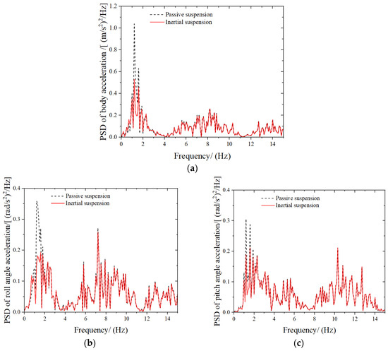 In order to analyze the performance of the inertial suspension in the frequency domain, the time domain performance indicators diagram under random road input at 20 m/s is obtained by Fourier transform, and the power spectral density comparison diagram at 1–15 Hz is obtained, as shown in Figure 7.