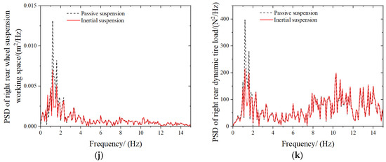 Power spectral density analysis of inertial suspension performance parameters. (a) Body acceleration. (b) Roll angle acceleration. (c) Pitch angle acceleration. (d) Left front wheel suspension working space. (e) Left front dynamic tire load. (f) Right front wheel suspension working space. (g) Right front dynamic tire load. (h) Left rear wheel suspension working space. (i) Left rear dynamic tire load. (j) Right rear wheel suspension working space. (k) Right rear dynamic tire load.
