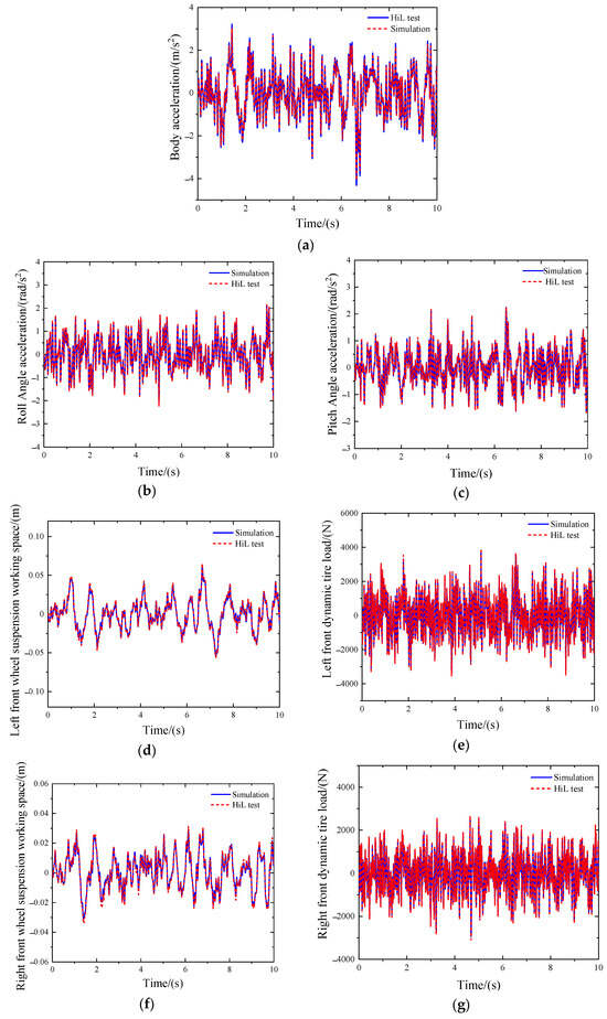 Figure 9 and Table 5 show the time domain curves and RMS values of body acceleration, body roll angle acceleration, body pitch angle acceleration, suspension working space, and dynamic tire load of the inertial suspension based on dynamic surface control in simulation and HiL test, respectively. It can be seen from Table 5 that in the HiL test, the RMS values of the body acceleration, roll angle acceleration, and pitch angle acceleration of the inertial suspension based on dynamic surface control are 5.76%, 4.91%, and 3.12% compared with the simulation results, which are shown in Figure 9. The performance indicators of the suspension based on the HiL test are consistent with the simulation results, and the error is controlled within 8%. In summary, the experimental results show that the controller based on dynamic surface control designed in this paper can meet the needs of vehicle controllers.