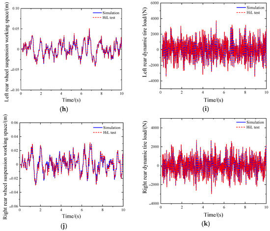 HiL and simulation test results. (a) Body acceleration. (b) Roll angle acceleration. (c) Pitch angle acceleration. (d) Left front wheel suspension working space. (e) Left front dynamic tire load. (f) Right front wheel suspension working space. (g) Right front dynamic tire load. (h) Left rear wheel suspension working space. (i) Left rear dynamic tire load. (j) Right rear wheel suspension working space. (k) Right rear dynamic tire load.