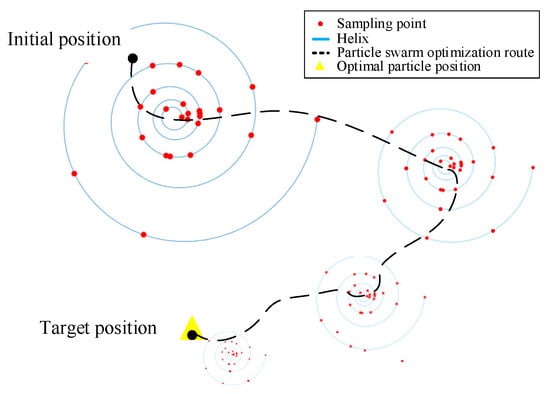 The spiral function is used to improve the optimization strategy of the traditional particle swarm optimization algorithm, which can effectively improve the global search ability of the particle swarm. The optimization process of this method is shown in Figure 2. When the particle update stagnation occurs, the spiral function is calculated with the current optimal particle as the center. With an increasing number of iterations, the spatial size of the spiral function distribution and the number of sampling points are gradually changed. The trend is that the dispersion space will become smaller and the number of sampling points will become greater, but the value of the dispersion space and the number of sampling points needs to be limited.