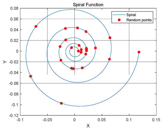 On the spiral function, the points are randomly selected via normal distribution, as shown in Figure 3. The red dots in Figure 3 are the points taken, with the starting and ending positions on the helix as the boundary and the middle part randomly selected.