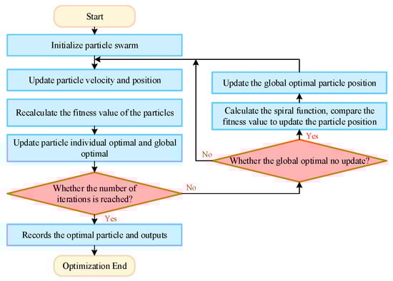 In the process of iteration, the PSO algorithm will have a long time for the iteration without updating the fitness value, indicating that the calculation of the particle swarm in this interval is of little significance or that the calculation results have not progressed. When this problem occurs, the improved particle swarm optimization algorithm is based on whether the same fitness value appears in the search. Before entering the next step of calculation, the spiral function centered on the global optimal value appearing in the current iteration number is preferentially calculated. Random sampling points are randomly selected on the generated spiral function in the form of a normal distribution, and the fitness values of these sampling points are calculated step by step. If there are better particles than the global optimal particle position in the current iteration, the algorithm will randomly replace the particles in the current iteration. Thus, a part of the particle population is updated quickly to improve the efficiency of the next iteration, and the newly generated particles can avoid falling near the local optimal solution. A flowchart of the improved particle swarm optimization algorithm based on the spiral function is shown in Figure 4. The pseudocode for the improved PSO algorithm is described as Algorithm 1.