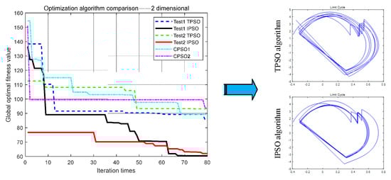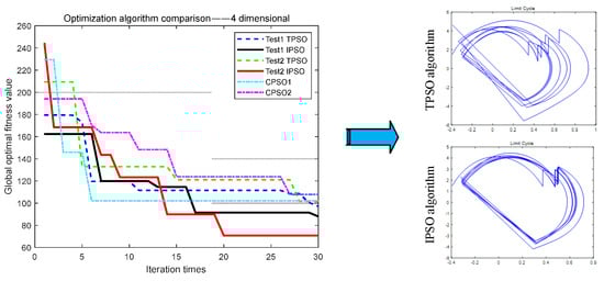 When optimizing the parameters of different dimensions, this paper tests multiple comparative algorithms. These algorithms include the improved particle swarm optimization algorithm (IPSO), the traditional particle swarm optimization algorithm (TPSO), the chaotic particle swarm optimization algorithm 1 (CPSO1), and the chaotic particle swarm optimization algorithm 2 (CPSO2). Random numbers and were replaced by chaotic sequences in CPSO1 []. Additionally, a chaotic search was conducted as the inactive particles were randomly generated and incorporated in the new population in CPSO2 [].