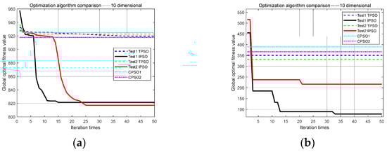 The ten-dimensional comparison test for the optimization algorithms: (a) higher fitness value position; (b) lower fitness value position.