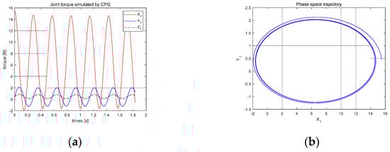 The CPG oscillator output results: (a) joint torque simulated by CPG; (b) phase space trajectory.