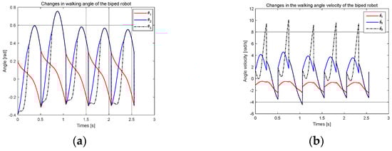 The walking results of the biped robot: (a) changes in the walking angle of the biped robot; (b) changes in the walking angle velocity of the biped robot.