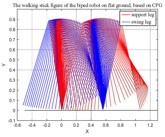 The walking stick figure of the biped robot on flat ground, based on CPG.