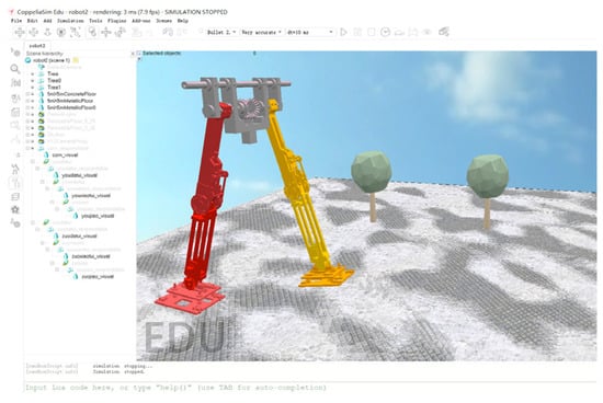 In order to simulate the biped robot walking on the flat ground, the robot’s mechanical model was imported into the cross-platform, open-source simulation software V-REP (V4.1.0). Additionally, MATLAB (R2022b) was used to conduct the optimization process and control the biped robot to walk.