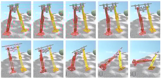 In the flat ground scene of V-REP, the one-step walking gait of the biped robot based on the unoptimized CPG parameters is shown in Figure 13. The robot could not maintain balance and easily fell.