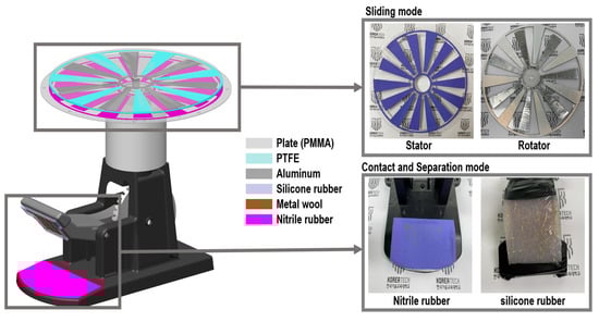 The fabrication of the TENG in sliding mode is shown in Figure 1. The stator part involves layering an aluminum electrode pattern on a PMMA disk structure and placing nitrile rubber as the tribo-material on top. The rotator part is completed by layering an aluminum electrode pattern on a PMMA disk structure and placing PTFE as the tribo-material on top.