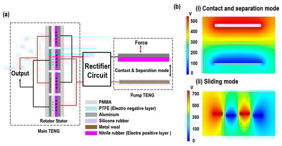 Figure 2b shows the electric field formed when a potential difference occurs in the Pump TENG and Main TENG. This result is derived from the COMSOL software. In (i), the contact and separation mode shows the potential difference formed by the contact and separation actions and the charge movement caused by the triboelectric effect. In (ii), the sliding mode simulates the periodic change in potential difference by modeling the positional changes in the moving triboelectric layers. Detailed interpretation conditions are shown in Table 1.