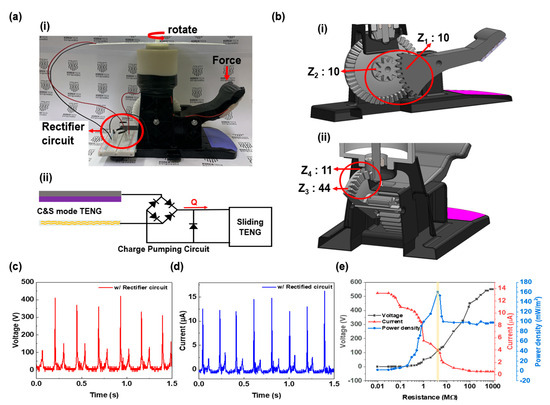 When examining Figure 3a, it can be seen that the contact and separation mode passes through a rectifier circuit and connects to the sliding mode. Figure 3b shows that a total of four gear parts are used to convert linear motion into rotary motion. The first gear pair converts linear motion into vertical rotary motion. The push force is amplified by N times by the lever and transmitted to gear Z1. In (i), gear Z1 is designed to only transmit force in one direction using a ratchet gear mechanism to prevent reverse rotation. Gears Z1 and Z2 have a gear ratio of 10:10, meaning that Z2 rotates at the same speed as Z1. Gears Z2 and Z3 are mounted on the same circular plate, and this pair of gears converts vertical rotary motion into horizontal rotary motion. Z3 and Z4 have a gear ratio of 44:11, with Z4 rotating four times faster than Z3. In the sliding mode, the rotating electrode plate is arranged horizontally to maintain a uniform gap against gravity, which is advantageous for system stability. By utilizing these four gear parts, a total speed increase of four times can be achieved. Each gear is made of ABS and POM materials and manufactured through CNC machining.
