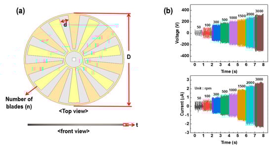 Figure 4a shows that the final output of the proposed LRC-TENG comes from the Main TENG in sliding mode. Therefore, the final output varies according to the design of the sliding mode TENG. To derive the optimal design, the design parameters were set as the overall diameter D, the gap between the electrodes d, and the number of blades n. The output was measured at different rotational speeds based on the basic design parameters D = 200 mm, d = 15 mm, and n = 7. Figure 4b demonstrates that the rotational speed was controlled through motor control, and the rotational speeds used in the experiment ranged from 50 to 3000 rpm. As the rotational speed increased, the output voltage and current increased proportionally. At the maximum rotational speed of 3000 rpm, the output was 300 V and 2.5 μA. This is the original output of the sliding mode without applying the self-pumping technology.