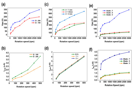Sliding mode parameter study and output performance test of various parameters. (a) Voltage output according to disk diameter, . (b) Current output according to disk diameter, . (c) Voltage output according to disk thickness, . (d) Current output according to disk thickness, . (e) Voltage output according to number of blades, . (f) Current output according to number of blades, .