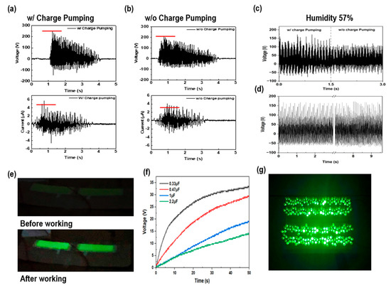 Evaluation of output performance of charge-pumping mechanism using power supply. (a) Output performance with charge pumping. (b) Output performance without charge pumping. (c) Comparison of charge pumping output performance at 57% humidity. (d) Long-term stability test of LRC−TENG over multiple cycles of operation. (e) Device images before and after EL operation. (f) Voltage charging curves for different capacitance values. (g) LED illumination through LRC −TENG.