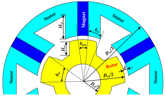 With the relative rotation between the rotor and the stator, the flux in windings changes. Because of the doubly salient pole of the FSPM motor, the reluctance of its magnetic circuit is not uniform, which leads to the harmonic components in motor torque and affects the purity of torque output. The parameters in Table 1 all have a certain influence on the magnetic circuit of the motor. However, the parameter that has the most significant effect on the torque ripple is the salient pole dimensions at the air gap bst, brt, and bpm, which influence the motor winding flux dynamically. Then, the specific parameters are analyzed by FEM in the next section.