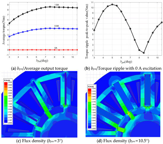The output average torque of the motor tends to increase as the angle of the permanent magnets increases. The increasing of the permanent magnet angle promotes the magnetic potential; meanwhile, the reluctance of the entire magnetic circuit does not change, and the total flux increases. Thus, the output torque of the motor can be increased with the same winding current excitation. According to the data in Figure 3a, the 250% increase in permanent magnet angle yields only a 63.5% increase in output torque. When the permanent magnet angle is greater than 7.5°, the magnetic circuit saturates (Figure 3d); the magnetic potential of the permanent magnet is excess. Therefore, it is appropriate to choose a permanent magnet angle range from 4.5° to 7.5° for further optimization and the reduction in permanent magnet material used. Figure 3b expresses the influence of torque ripple peak-to-peak value with bpm changes. It can be seen from the figure that the change in bpm has a significant impact on the torque ripple. The change in bpm angle will cause the variation in flux linkage during rotation that leads to the change in torque harmonics. The torque harmonics generate torque ripple. The change in bpm essentially makes the whole stator salient pole angle change synchronously. Therefore, in practice, this result is only for reference, and it is also necessary to find a method to reduce torque ripple by combining the multi-parameter joint together.