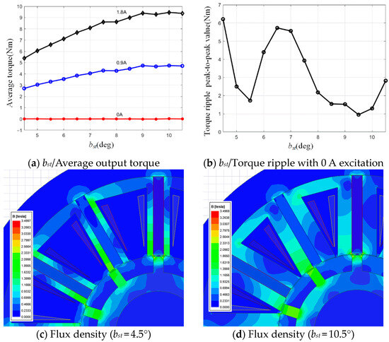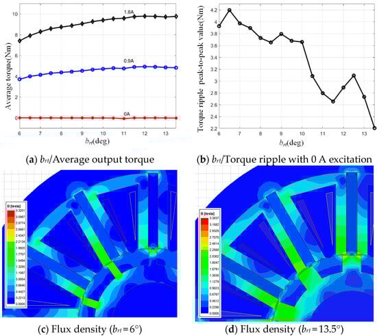 From Figure 5, the average torque of the motor rises with the bst increases. The increase in bst increases the cross-sectional area of flux flow at the air gap, which improves the winding magnetic flux and also enhances the motor output torque. Its principle is similar to the brt. However, due to the fixed brt, the magnetic flux is limited. The motor torque ripple is sensitive to the bst, and there are two minimum value of torque ripple in the tested range. The value of torque ripple shows the amplitude of harmonic components in the torque; it contains the information of flux changes during rotation. When bst is near 9.5°, the motor has the greater average torque output, so it is appropriate to choose a stator tooth angle of 8° to 10° for the further optimization.