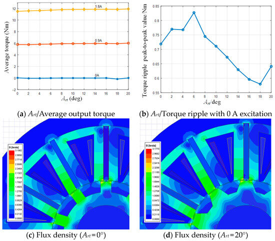 From Figure 8, the Art has little effect on the average output torque. With the Art increases the average torque slightly rises. The change in Art can slightly change the air gap shape, which leads to the variation in torque ripple amplitude. That makes the flux harmonic change. The torque ripple gets the lowest value when Art is at 18°. So, the Art value was determined as 18° in practice finally.