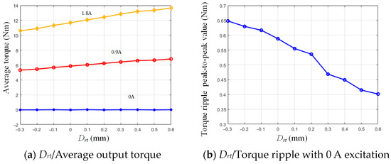 The Drt affects the air gap length in the area of the rotor salient pole. Its change may bring the torque harmonic variation and then affect the torque ripple. In the FEM model, the initial dimensions of the motor are the values after optimization in Section 4. The Art sets to 18° in this analysis. The Drt ranges from −0.3 mm to 0.6 mm with a step of 0.1 mm. The torque performance at the winding excitation current is from 0 A to 1.8 A, as shown in Figure 9.