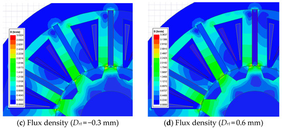 The increase in Drt substantially reduces the length of the air gap, and it will promote the average torque theoretically. From Figure 9, the results proved this point. With the increase in Drt, the distance between the rotor and stator pole is uniform. That makes the amplitude of harmonic components trend downward. But, the Drt is restricted by the mechanical structure. So, the Drt finally sets to 0.5 mm. This dimension is 0.25 mm longer in the radial direction than the outside circle of the rotor. That means the minimal air gap is 0.75 mm at the center line of the rotor salient pole.