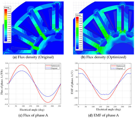 Finally, the motor dimension data are determined and the promotion of performance is evident after optimization. The comparison is shown in Table 6 and the flux density is shown in Figure 10. The AVG torque stands for average torque and the angle of PM presents the volume of permanent magnet usage.