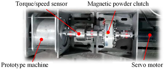 A resolver is installed at the end of the motor axis to monitor the rotary angle. From this sensor, the rotor position is easy to obtain for the vector voltage control. This motor is installed on a motor test bed as Figure 13 shows. The test bed consists of a torque/speed sensor, magnetic powder clutch, servo motor, and data acquisition devices. The magnetic powder clutch can be replaced by a magnetic powder brake if the test is needed. The motor is driven by a synchronous motor driver, which uses the SVPWM method to drive the motor.