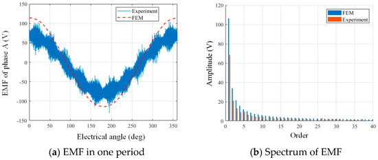 In the no-load EMF test, the magnetic powder clutch is set as the connector between the prototype and the servo motor. The servo motor speed is set at 300 rpm, the phase A’s EMF of FEM result and experiment test are shown in Figure 14.