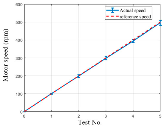 In the speed test, the magnetic powder clutch disengages. The controller reference speed values set range from 0 to 500 rpm with a step of 100 rpm, and then the driver drives the motor running at the reference speed. The actual speed of the motor is measured by the sensor and recorded on an upper computer. The results are shown in Figure 15. At each speed, the motor runs at a constant speed, and its measurement data are accompanied by fluctuations. Therefore, error bars are used to describe the fluctuation in the measured data.