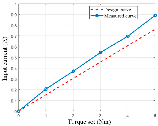 In the torque test, the magnetic powder clutch is replaced with a magnetic powder brake. By adjusting the input current of the brake, the brake can provide different loading torque in the process of the experiment. The motor sets the reference speed at 30 rpm. Then, it adjusts the input current of the brake to change the loading torque, and its value feedback from the torque sensor. The loading torque values set ranges from 0 to 5 Nm with a step of 1 Nm. In each situation, the motor runs at a constant torque, and the three-phase current is measured and averaged at its RMS value to represent the input current. The torque and current are tested and the results are shown in Figure 16.