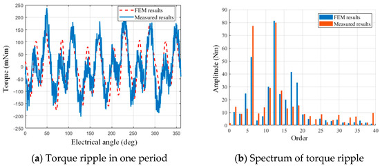 Generally, from Figure 17, the torque ripple basically matches the performance calculated by FEM. At the sixth-order frequency, the experimental measurements are slightly lower than those calculated by FEM. This may be due to the fact that the actual size of the motor is slightly different from the FEM, such as the small chamfer. Such small structures have the potential to smooth magnetic flux changes and thus reduce the amplitude of the torque ripple. The measured signal contains a large number of high-frequency signals, which is mainly due to the noise of the sensor. There is also some resistance to torque during actual rotation. This is mainly due to the existence of certain friction in parts such as bearings that support the motor rotor. Although no greased bearings were used on this prototype, the effects of friction resistance were still unavoidable.