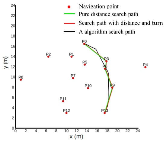 In the second path-planning experiment, the objective was to analyze and compare the performance of the Floyd and A* algorithms under varying weight conditions within directed weighted graphs. The experiment was designed with two distinct weight configurations, using point P0 as the starting position and point P13 as the destination. By applying the Floyd algorithm to both graphs, the paths were determined and subsequently compared with the paths generated by the A* algorithm for the same starting and ending points. Figure 16 illustrates the experimental outcomes, providing a visual representation of the paths selected by each algorithm under the different conditions. The core aim of this experiment was to rigorously assess the effectiveness and adaptability of these algorithms when exposed to diverse weight scenarios. By systematically evaluating their performance, we sought to elucidate the strengths and weaknesses of each algorithm in terms of computational efficiency, path optimality, and adaptability to varying graph weights. This comparison is critical for understanding the suitability of each algorithm in different practical applications, particularly in environments where weight factors are subject to change, thus offering a nuanced perspective on their real-world applicability and robustness.