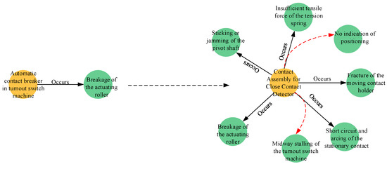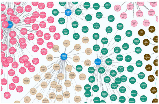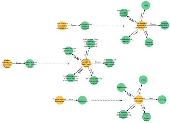 The processed knowledge triplet dataset, named the HRTOM dataset, is stored in the Neo4j graph database, completing the construction of the high-speed railway turnout switch machine maintenance knowledge graph. A partial visualization of this knowledge graph is shown in Figure 2.