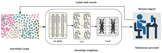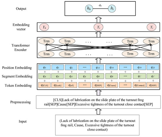 With the expansion of railway networks and increasing train speeds in China, the demand for reliable and safe signal infrastructure in the railway industry is rising []. There are many types of signal equipment failures, and their impact range is extensive []. As the actuator in the railway turnout switch system, the turnout switch machine converts electrical energy into mechanical energy through an internally mounted motor, driving the switch machine to control the switching of railway turnouts and enabling the train to switch and steer between different tracks. Its performance directly impacts the safety and efficiency of railway transportation [], making it a key focus in high-speed railway signal equipment maintenance. It is crucial to detect all types of faults, as fault detection is instrumental in improving the level of intelligence of railway operations and optimizing their efficiency []. Numerous railway researchers have adopted data-driven approaches to analyze equipment failures. Reference [] investigated the ZDJ9 switch conversion power curve, summarizing typical on-site failure types and causes, and developed a high-speed railway switch fault diagnosis model using the improved SSA-SVM algorithm. Reference [] focused on the normal conversion and action curves of the S700 switch machine under failure conditions, using deep learning algorithms to extract image features, and achieving real-time fault diagnosis via the DCNN-SVM method. Reference [] performed fault diagnosis using the sound of the switch machine during operation, addressing the limitation of traditional methods that rely solely on electrical signals without considering the physical characteristics of electromechanical systems. The abovementioned studies on switch equipment failures primarily focus on structured data. As high-speed railway operating mileage accumulates, substantial amounts of diverse data, including text, video, and images related to switch equipment operation and maintenance, have been collected, making unstructured data, particularly text data, the dominant component of big data. These text data contain critical information for ensuring railway safety. These switch operation and maintenance data are stored in an unstructured text format, serving as a knowledge base for future fault identification, diagnosis, and repair. However, the unstructured text data for high-speed turnout switch machine operations and maintenance are still recorded manually, resulting in issues such as ambiguity and irregularity in many fault records, challenges in computer processing, time-consuming manual analysis, and incomplete fault information mining []. When equipment faults occur, maintenance personnel must determine the cause based on specific conditions and relevant documents, resulting in relatively inefficient repairs. A knowledge graph is a knowledge base structured as “entity–relationship–entity” triplets, depicting concepts, entities, and their interrelationships in the physical world [], thus effectively representing complex information. Knowledge graphs have been applied in fields such as power [], aviation [], and disaster management []. In the railway domain, Reference [] organizes multi-source knowledge of high-speed trains to construct the schema layer of a high-speed train knowledge graph. Based on this conceptual schema, a data layer is developed to build domain-specific knowledge graphs for various stages of high-speed train operations. Reference [] constructs a multi-domain integrated high-speed train maintainability knowledge graph, effectively integrating multi-source data to assist designers in train maintainability design and improve product quality. Reference [] analyzes railway onboard fault maintenance logs and constructs a knowledge graph for railway onboard equipment faults, enhancing the knowledge discovery capability of fault logs and supporting intelligent maintenance. Reference [] used semi-structured data from high-speed railway turnout equipment and applied a reinforcement learning-based approach to construct a knowledge graph for fault handling, thereby assisting maintenance personnel in decision making. However, the knowledge graphs generated through manual or semi-automated methods are often sparse and incomplete, leading to low-quality outputs with limited applicability. Research on knowledge graph completion in the railway domain is limited. Thus, filling the missing parts of the knowledge graph triplets is essential for enhancing the knowledge system, improving structural integrity, and providing a robust data foundation for decision support, preventive maintenance, and other railway maintenance applications.