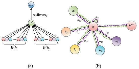 In the formula, is the vector used to calculate the attention score, || represents the vector concatenation operation, and LeakyReLU is the activation function. Next, the attention coefficients of all the neighboring nodes are normalized using the Softmax function, as shown in the formula: