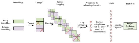 In the formula, represents a set of filters; “” is the convolution operator; transforms the tensor into a vector; and is the activation function. Finally, the Logistic Sigmoid function is used to generate the prediction values for entities and relations.