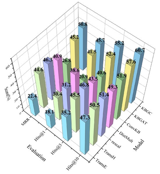 To evaluate the generalization ability of the proposed model, experiments were performed on the public datasets FB15k-237 [] and WN18RR []. The experimental results are presented in Table 3. The results indicate that the proposed model achieves strong performance, with the MRR values on FB15k-237 and WN18RR improving by 1.8% and 4.5%, respectively, compared to the state-of-the-art KBGAT model. These findings demonstrate that the proposed KBGC model exhibits excellent generalization ability.