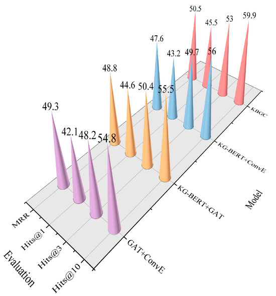 As illustrated in Figure 8, the proposed model outperforms the other models in terms of performance metrics. Compared to the GAT + ConvE model, the proposed model shows a 1.2% and 5.1% increase in MRR and Hits@10, respectively. This is because the GAT + ConvE model’s ability to represent semantic information is limited when extracting entities and relationships from triplets, resulting in lower prediction accuracy. This indicates that incorporating the KG-BERT model as a pre-training strategy effectively enhances the extraction of intrinsic triplet features, optimizes the training efficiency of the graph attention network, and improves the representation of entity and relationship encoding, thereby boosting link prediction performance. Compared to the KG-BERT + GAT model, the proposed model shows a 1.7% and 4.4% increase in MRR and Hits@10, respectively. This is because without ConvE, the KG-BERT + GAT model struggles to extract effective local features from long-tail entities, resulting in poor performance when dealing with rare entities. Consequently, the model’s ability to generalize to long-tail entities and relationships declines during prediction. Compared to the KG-BERT + ConvE model, the proposed model shows a 2.9% and 3.9% increase in MRR and Hits@10, respectively. This is because without GAT, the KG-BERT + ConvE model can only capture dependencies for single-hop or short-path relationships. It fails to model long-path dependencies (e.g., multi-hop reasoning) or cross-entity relationship patterns, resulting in reduced prediction accuracy. The proposed model leverages graph structure, global semantic information, and convolutional features, thus achieving superior performance in triplet prediction tasks.